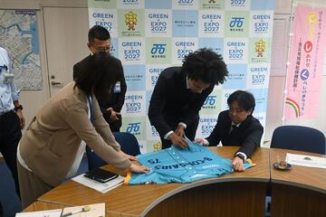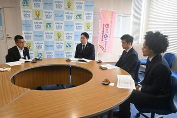 白井 英介 代表取締役、植田 哲也 取締役、キング 開 選手にお越しいただき、今シーズンの奮闘と成果について白井代表からご報告いただきました。また、キング選手からは、「自分たちより強いチームに勝つことができたシーズンでもあり、来シーズンはより上位チームに勝てるように頑張りたい」と力強い意気込みを伺い、今後の活躍にますます期待が膨らみます。