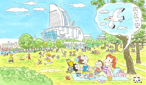 いつもにぎやかなみなとみらい21地区のクイーンズスクエア横浜内を通り、大きな展示ホール横を行くと臨港パークに出る。ベイブリッジや赤レンガ倉庫が見えて横浜港が広がり、潮入の池や広い芝生広場がある。