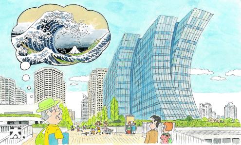 公園の中央から臨港パーク方面に歩くと、昨年4月に開通した長さ約56メートルの歩行者デッキ「キングモール橋」がある。橋の右側には、同じ昨年4月に開業した国内最大規模の大型多目的ホールと多数の会議室がある「パシフィコ横浜ノース」が建っている。左側には同じ昨年に竣工した「ザ・カハラ・ホテル」と「横浜ベイコート倶楽部ホテル(会員制)」の豪華ホテルが建っている。その総ガラス張り(?)ホテルの迫力ある壁面を見て、私は江戸時代の傑作浮世絵を連想した。葛飾北斎筆「富嶽三十六景・神奈川沖浪裏」の大波を…。