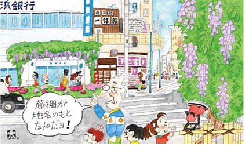 今も、「安いよ~!」と活気のある掛け声が聞こえ、下町のフンイ気いっぱいの五つの商店街が並ぶ。商店が立ち並ぶ道は保土ケ谷道と呼ばれ、江戸時代から、保土ケ谷宿から戸部へ行ける道として利用されてきた。明治時代の初め、交差点角に酒まんじゅう店があり、その店先に藤棚があった。四月下旬になると、その藤の花が咲き、道行く人々の目を楽しませてきた。昭和三年にこの藤棚から、地名が「藤棚町」になった。今年も復元された藤棚に美しい花を咲かせている。