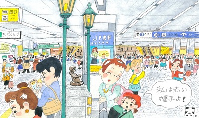 JR横浜駅の東口と西口を結ぶ、広い中央通路の中央に「赤い靴はいてた女の子像」がある。有名な山下公園にある、童謡「赤い靴(野口雨情作詞)」の歌詞を主題にして作られた女の子像の高さ26センチのレプリカブロンズ像だ。