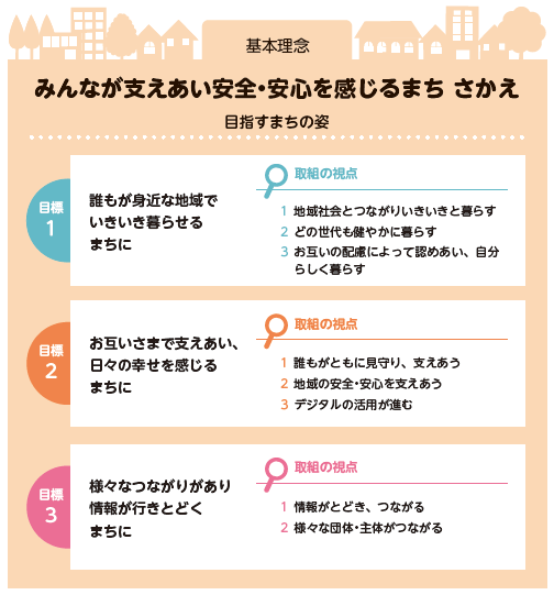 第5期計画では、第3期からの基本理念「みんなが支えあい安全・安心を感じるまち さかえ」を計画期間を問わない普遍的なものとして継承し、より暮らしやすい地域を目指します。