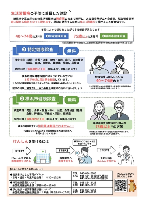 横浜市国民健康保険に加入していて、年度内に40歳~75歳の誕生日を迎える方(75歳になる方は、誕生日の前日まで)が対象となります。※一部の条件に該当する人は特定健康診査の対象とはなりません、詳しくは健康福祉局保険年金課のページをご確認ください。