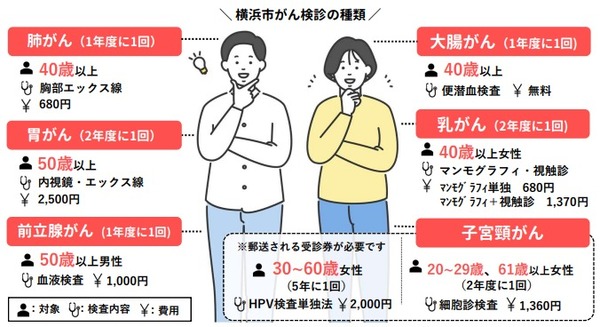 ※詳細ながん検診の種類・受診条件や費用が免除になる方について等は横浜市医療局がん・疾病対策課のページをご確認ください。