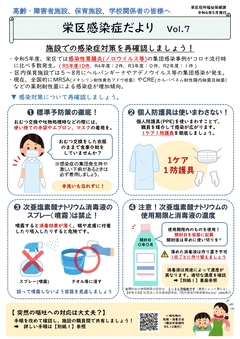 栄区では、高齢・障害者施設、保育施設、学校関係者の皆様に向けて、年数回「栄区感染症だより」を発行しています。施設などでの感染症の予防・感染拡大防止にお役立てください。