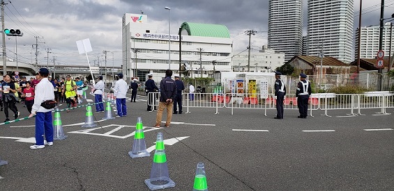 コースの走路員(一般通行者のコース侵入の阻止等の安全管理)、距離表示員、横断歩道誘導員や、ランナーの手荷物預かり員等として派遣され、大会の安全な運営に従事します。