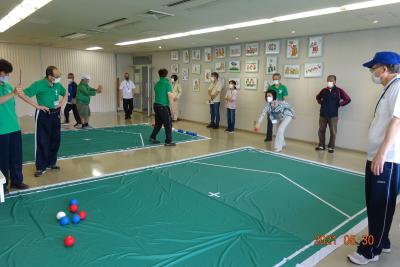 横浜市スポーツ協会の職員と、さわやかスポーツ普及委員会の皆さんによる指導のもと、ボッチャの体験をしました。