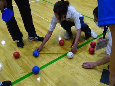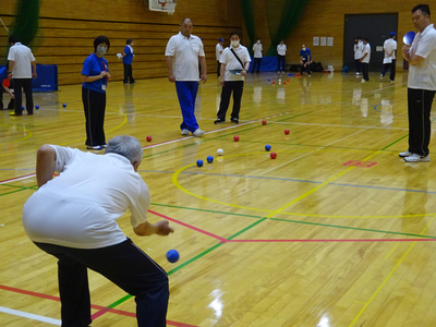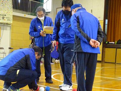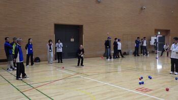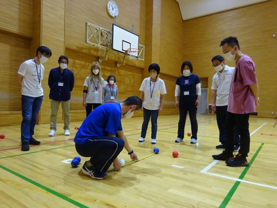 実際に、チームに分かれボッチャ大会を行いました。全員が対戦と審判を経験することで、12月開催の「ふれあいボッチャ大会(区民対象・パラフェスタ♡さかえ内)」での運営や、 各地区でのスポーツイベント実施の際の参考とすることができました。