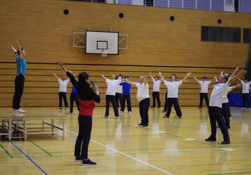 「ラジオ体操第一」「第二」「みんなの体操」について、正しい姿勢や伸ばす筋肉等の細かいポイントの指導があり、休憩を挟んで2時間に渡る充実した研修会になりました。