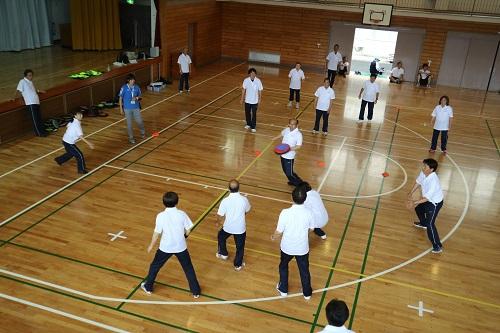 ニュースポーツ体験として、栄スポーツセンターの職員と、さわやかスポーツ普及委員会の皆さんによる指導のもと、ドッチビー、ボッチャ、グラウンドゴルフのルールを学びながら、実際に体験をしました。