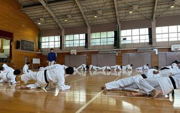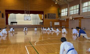空手の柔軟性を高めるストレッチや可動域を広める方法など、ケガ予防に有効なストレッチ等の実技講習を行いました。