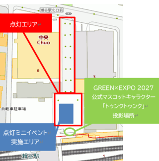GREEN×EXPO 2027公式マスコットキャラクター「トゥンクトゥンク」を駅壁面に投影します。