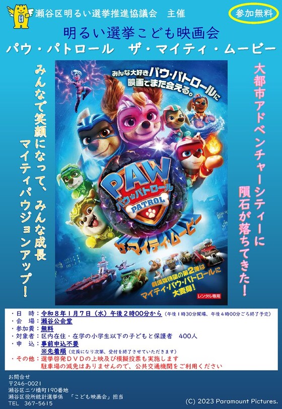 明るくきれいな選挙の実現と区⺠の投票参加の促進を目的とした啓発活動の⼀つとして、明るい選挙こども映画会を開催します。