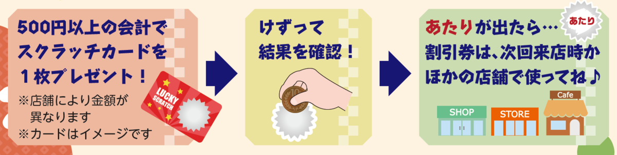 イベント期間中に、対象の店舗でお買い物(500円以上)すればスクラッチカードをプレゼント♪ あたりが出たらお得な景品をプレゼントします!