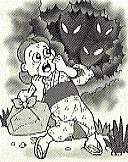 おとらさんは、さっそく八柵へ行って見ることにしました。一口に八柵といっても山や峠をいくつも越えて歩いていかなければなりません。おとらさんは真っ暗なうちに家を出て、やっとの思いで八柵にたどり着きました。だが、祈とう師の家はまだ雨戸がしまっていてだれ一人起きていません。庭に入って行くと暗がりのなかで、目玉みたいなものがいくつも光り、こちらをじっとにらみつけ、今にも飛びかかってきそうな様子です。