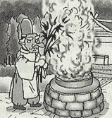 あかあかと燃える炎をうつして湧(わ)きあがる湯気,ひびきわたる祝詞(のりと),人々は熱湯(ねっとう)に浸したささでお祓(はら)いを受けると,神のもとへ引き寄せられる思いがしたそうです。いよいよ神主が,四方から幸運の矢を放(はな)つ頃になると,神事(しんじ)も最高潮に達し,熱湯の湯気をくぐりぬけてくるその矢を拾って,この年の幸運に恵まれようと夢中になったということです。