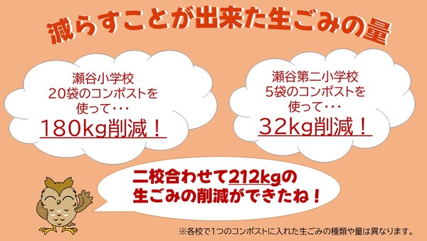 今回の瀬谷小学校と瀬谷第二小学校の取組を通じて、給食から出ていた生ごみを合計212kg削減する事ができました!