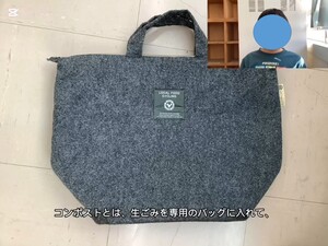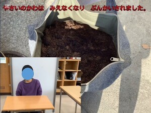 堆肥作りには、学校給食の調理残渣(野菜の皮やパン)を使いました。コンポストバッグの中で生ごみが堆肥へと目に