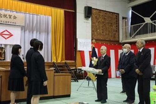 記念品贈呈では、学区内の3つの連合自治会(瀬谷第四、細谷戸、相沢)から、今年の夏に新設された武道場に掛けられるようにと時計が、実行委員長からは創立50周年記念が印刷されたクリアファイルとハンカチがそれぞれ代表の生徒さんに贈呈されました。