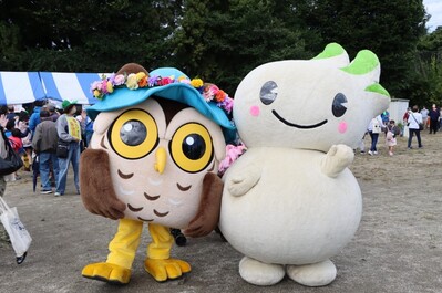 三ツ境駅前商店会のマスコットキャラクター「ミックル」(右)とせやまるも皆さんをお出迎えしました