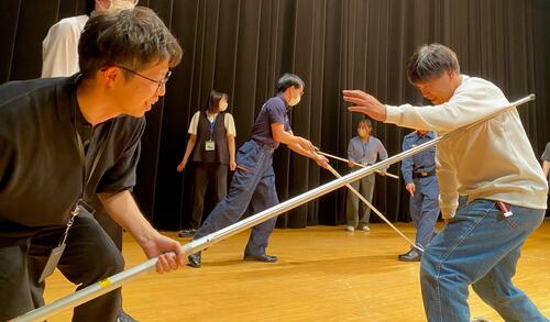 区役所のさすまたは、先端がU字のものとU字の両端に返し部が付いた2種類あり、それぞれの特性を確認しながら、実際に扱ってみました。