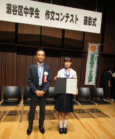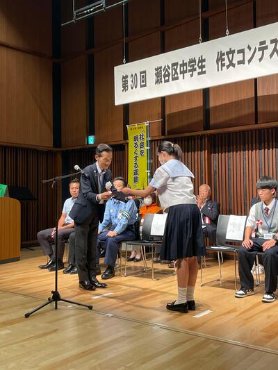 今回はその中でも横浜隼人中学校1年生の小野 惺友那さんの「言葉の責任」を区長賞として選ばせていただき、表彰式においてご本人に賞状を授与しました。