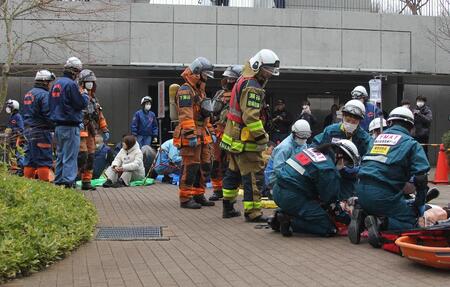 訓練は、区役所ロータリーに一般乗用車が進入し、運転手が刃物を振り回し火炎瓶を投げ逃走、多数の負傷者が発生する事案を想定しました。警察による犯人制圧、消防による消火・救助・救急活動、病院によるトリアージ、消防団による避難誘導など、各機関が連携し一連の対応を確認しました。