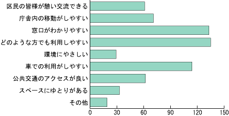 「新しい庁舎はどのようになると良いとおもわれますか」という質問に、「どのような方でも利用しいやすい」、「窓口がわかりやすい」と回答されたかたが多くいました。