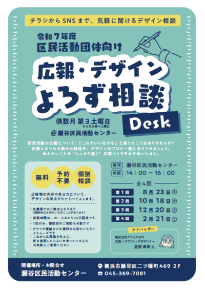 瀬谷区内でデザイン会社を運営しており、チラシやポスター、看板のデザインなど幅広く手掛けているほか、広報講座の講師として活躍していらっしゃいます