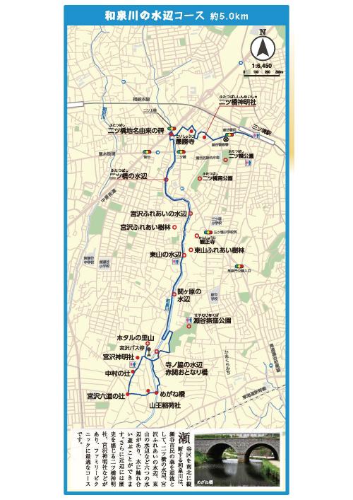 瀬谷区を南北に縦断する和泉川は、瀬谷市民の森を源流として、二ツ橋の水辺、宮沢ふれあいの水辺、東山の水辺など6つの水辺があり、水に触れ合い遊ぶことができます。さらに近辺には歴史を感じる二ツ橋神明社、宮沢神明社などがあり、ファミリーピクニックに最適なコースです。