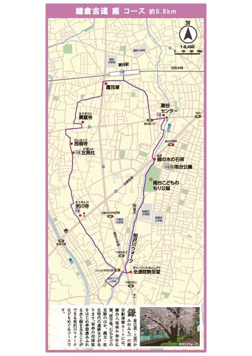 鎌倉古道・上道の瀬谷駅南側ルートには、瀬谷八福神や神社仏閣、庚申塔、石仏などの史跡のほか、縄文・弥生時代の遺跡などがあります。初春の河津桜をはじめ季節感あふれる緑と水を見ることができる相沢川ウォークなどもめぐるコースです。