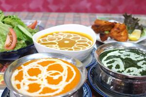 トマトベースに生クリーム、カシューナッツ、バターがたっぷり入った濃厚なバターチキンカレーが人気。