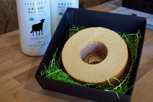 バターにひと手間加えて焦がしバターにし、県産米の米粉を使用した、豊かな風味としっとりとした食感が楽しめる口溶けのよいソフトタイプのバウムクーヘンです。