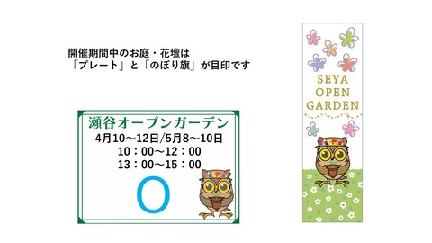 〇開催期間中のお庭・花壇は、「のぼり旗」と「プレート」が目印です。