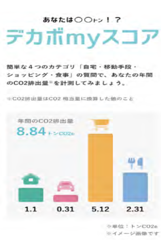 約12問の質問に回答するだけで、年間CO₂排出量が簡単にセルフチェックできる「デカボ my スコア体験」を実施しました。