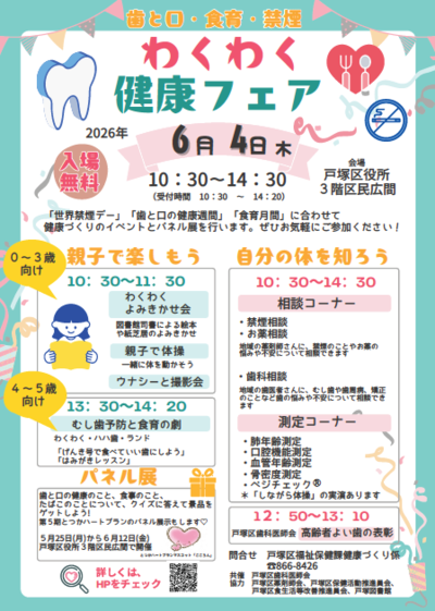 5月31日は「世界禁煙デー」、6月4日から10日は「歯と口の健康週間」、6月は「食育月間」です。これらに合わせて健康づくりのイベントとパネル展を開催します。ぜひ、お気軽にご参加ください。