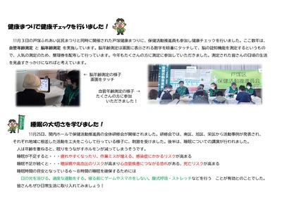 - 健康チェック(健康測定)の実施・・・さまざまな健康測定機器を使って、健康測定を行います。(血管年齢測定、足指力測定、握力測定、運動機能の測定など)