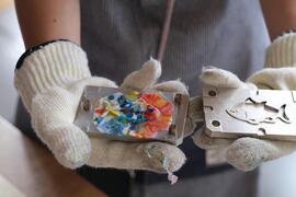 ・日本各地で採取された海洋ごみを選んで、キーホルダーを作ります。選んだ種類によって異なる色や模様に仕上がります。