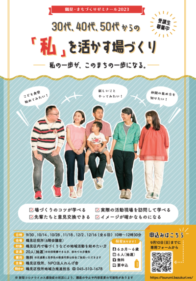 鶴見を学び、「いつまでも住み続けたいまち・鶴見」をつくるための体験型講座で、今年のテーマは、”私”を活かす「場づくり」です。