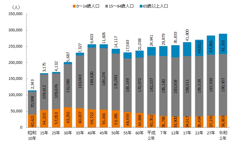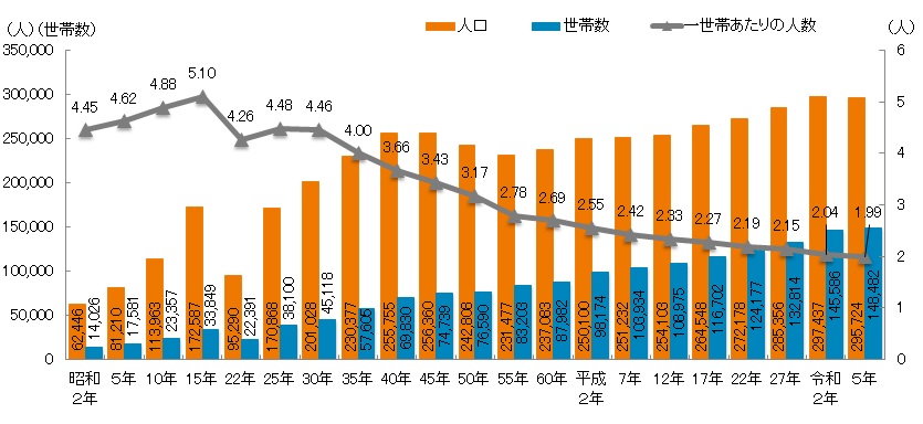 資料:国勢調査(各年10月1日現在、昭和2年は12月31日現在、令和5年は12月1日現在推計人口)