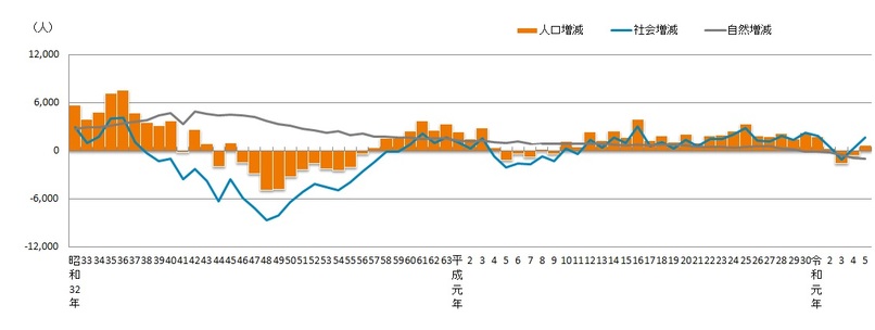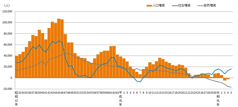 鶴見区の人口は、増減を繰り返しながら推移しています。昭和40年代後半に、転出者数が転入者数を上回ったこと(社会減)により、人口が大きく減少しました。昭和50年代後半から社会増に転じたことによって、人口が増加したものの、バブル期を経て平成4年より再び社会減・人口減の傾向が続きました。その後、平成12年からは社会増·人口増の傾向が続き、令和3年には社会減・人口減に転じましたが、令和5年には再び社会増・人口増になっています。また、平成30年から死亡者数が出生者数を上回り、自然減に転じています。