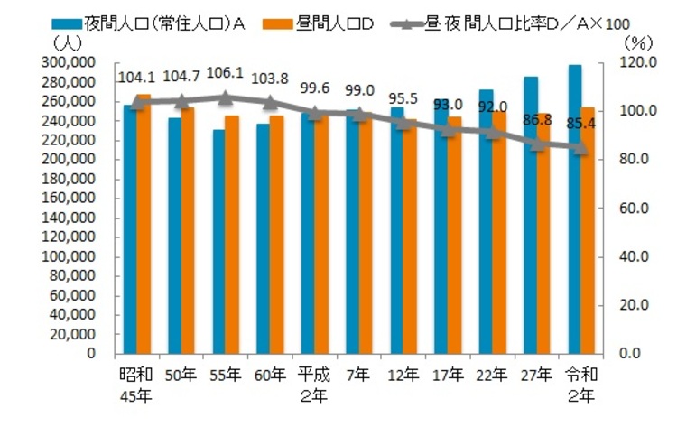 令和2年の鶴見区の昼間人口は253,976人、夜間人口は297,437人であり、平成2年以降、夜間人口が昼間人口を上回っています。また、昼夜間人口比率は85.4%で昭和55年の106.1%をピークに減少を続けています。
