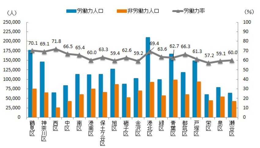 鶴見区の労働力人口は、176,428人で、行政区別にみると、港北区に次いで2番目の多さです。また、鶴見区の労働力率は70.1%で、18区中2位となっています。