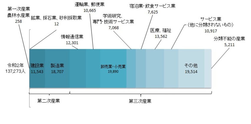 鶴見区の就業者は、第3次産業、第2次産業、第1次産業の順に多く、産業大分類別にみると、卸売業・小売業の就業者数が19,890人と最も多くなっています。