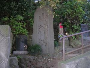 見返し坂の碑のそばに大きな「山神塔」の碑がある。碑の背面には、「大正9年10月に鶴見耕作地組合が起工した、鶴見・御子ケ谷線の道路工事の最大難所であるお墓山の開削工事は、大雨や大風に見舞われながら十有八ケ月もかかった、県下まれにみる大工事であった。しかし、諸神の加護により1人の死者も出さなかった。この恩を永遠に忘れないために山神の加護への感謝とお墓山の供養のために山神塔が建てられた」ということが記されている。