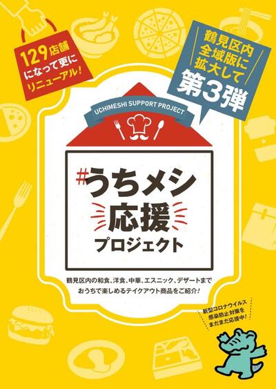 鶴見区では、自粛生活をおいしく、楽しく過ごすために鶴見の飲食店を応援してきた「#うちメシ応援プロジェクト実行委員会」と協定を締結し、区内飲食店のメニューやテイクアウト等の情報を掲載した「#うちメシ応援プロジェクト(パンフレット)」を発行しました。