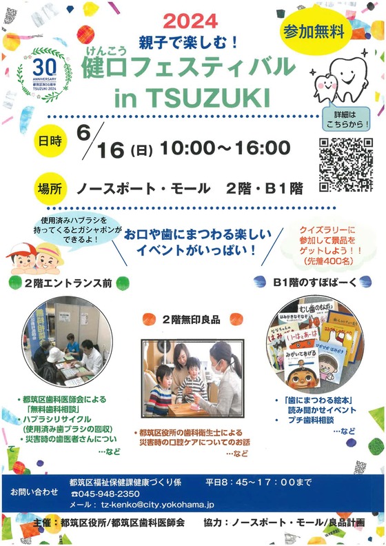 そこからはじまり、6月4日〜10日を「歯と口の健康週間」といい、歯や口の中の健康を見直す一週間とされています。都筑区では、親子で楽しみながらお口の健康について考えられるイベント「2024 親子で楽しむ!健口フェスティバル in TSUZUKI」を開催します!!楽しく参加してみませんか?