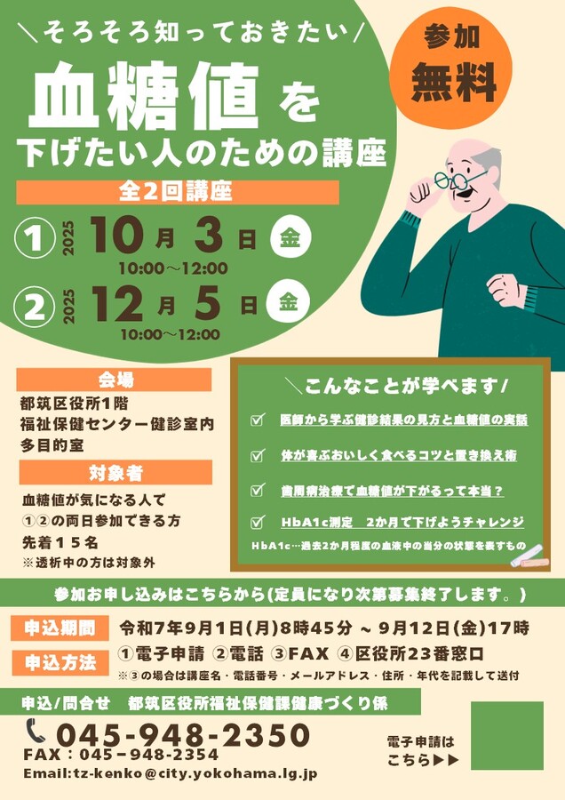 対象者・定員: 血糖値が気になる人で両日参加できる人 先着15名
