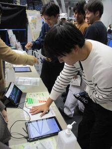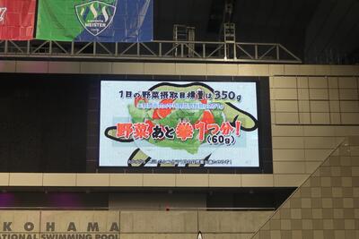 プロバスケットボールチーム横浜ビー・コルセアーズの試合会場及び卓球のTリーグの試合会場で、手のひらで推定野菜摂取量がわかるブースの出展や大型ビジョン等で動画放映を行いました。