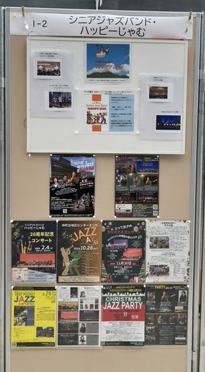 ハッピーじゃむの展示パネル、コロナ明けから再開した公演のポスターが目を引く